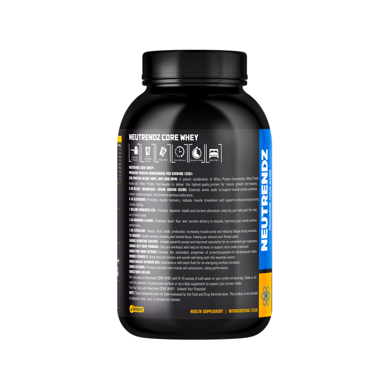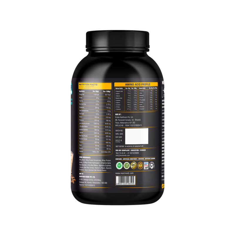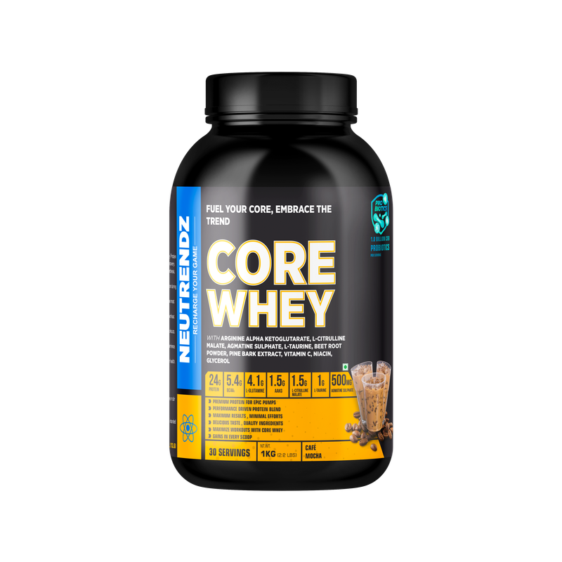 Neutrendz CORE WHEY 24g Protein in Caf? Mocha flavor combines the rich, robust taste of coffee with creamy chocolate. This 24g of protein per serving helps with muscle recovery, growth, and fat loss. The caf? mocha flavor provides a comforting, energizing taste, making it a great post-workout protein shake. The high-quality whey protein aids in repairing muscles and supports overall fitness goals. Ideal for those who love coffee and want to stay on track with their nutrition.