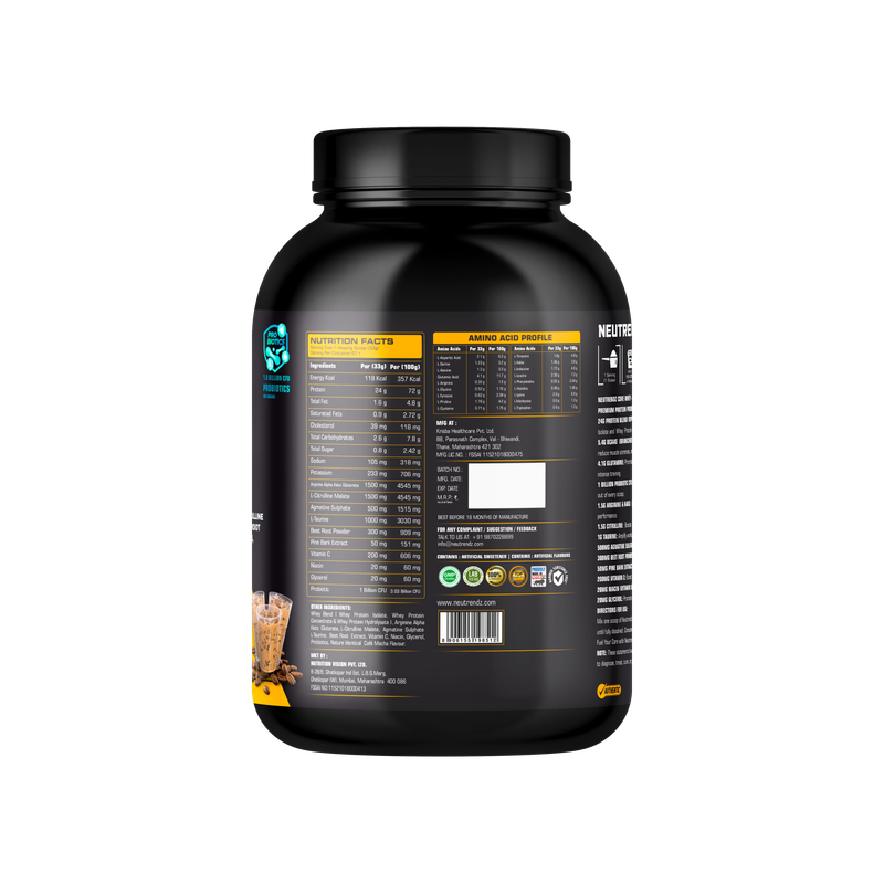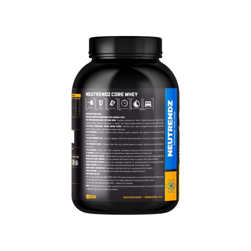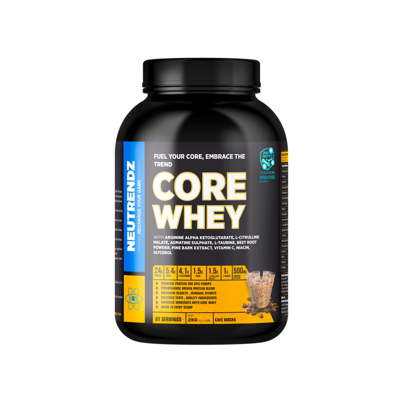 Neutrendz CORE WHEY 24g Protein in Caf? Mocha flavor delivers a perfect balance of rich coffee and creamy chocolate flavors, making it a satisfying and energizing post-workout treat. Each serving provides 24g of high-quality whey protein, promoting muscle recovery, lean muscle growth, and fat loss. The smooth mocha taste is perfect for coffee lovers looking for a protein supplement that tastes as good as it works.