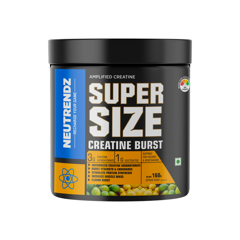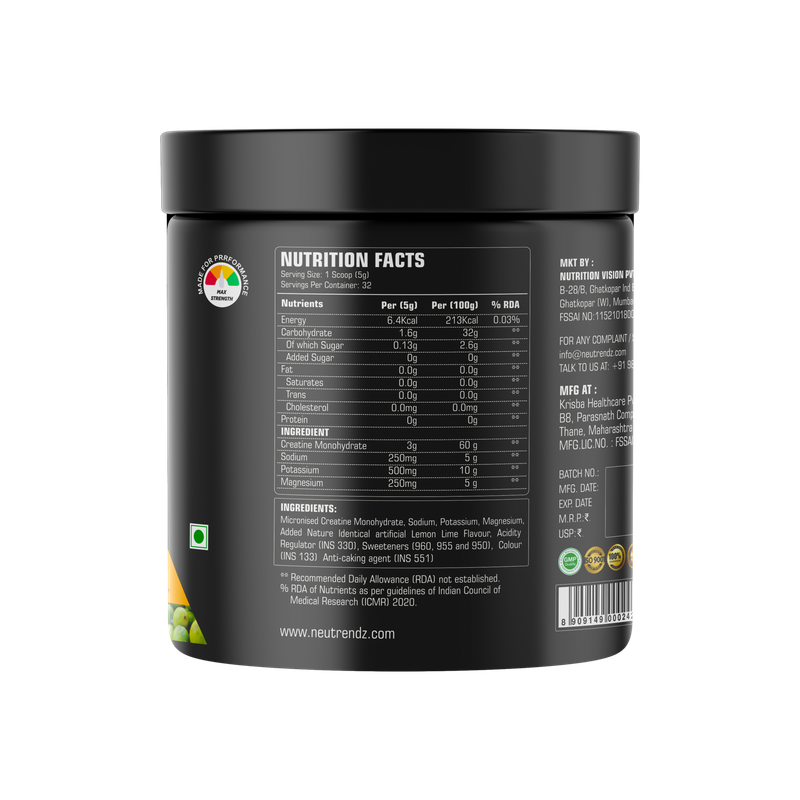 Neutrendz CREA PRO 160gm {Value Pack} Citrus Rush combines high-quality creatine with a refreshing citrus flavor, making it an ideal supplement for boosting muscle strength, endurance, and overall workout performance. The citrus rush flavor offers a zesty and energizing experience, perfect for enhancing your fitness routine. This creatine formula is designed to improve energy production, muscle mass, and recovery times, allowing you to push through every workout.
