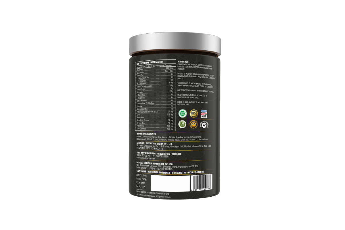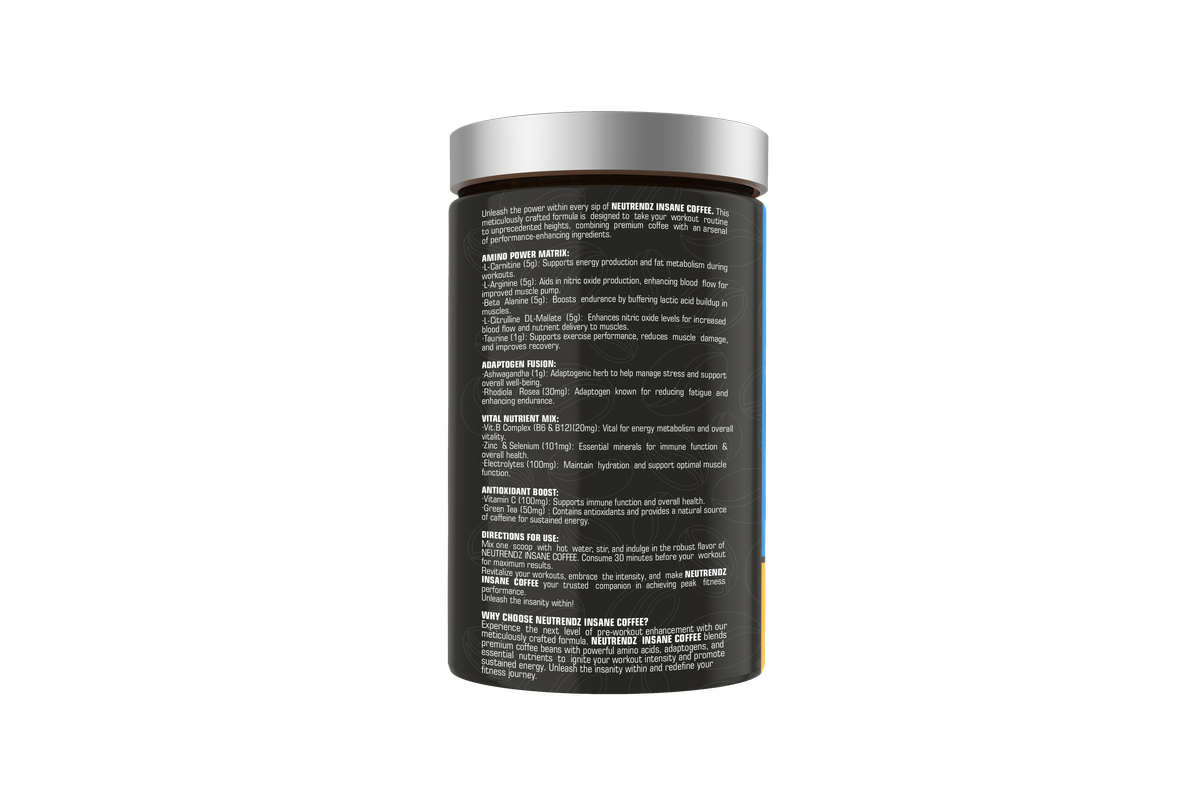 Neutrendz INSANE COFFEE 100gm is an all-natural coffee that offers a robust and intense flavor to kickstart your day or workout routine. Packed with natural caffeine, this coffee provides an instant energy boost, improving focus and alertness. Whether consumed as a morning coffee or before your training session, it provides sustained energy levels throughout the day. The coffee?s natural ingredients ensure that you get a clean, jitter-free energy boost without any crashes.