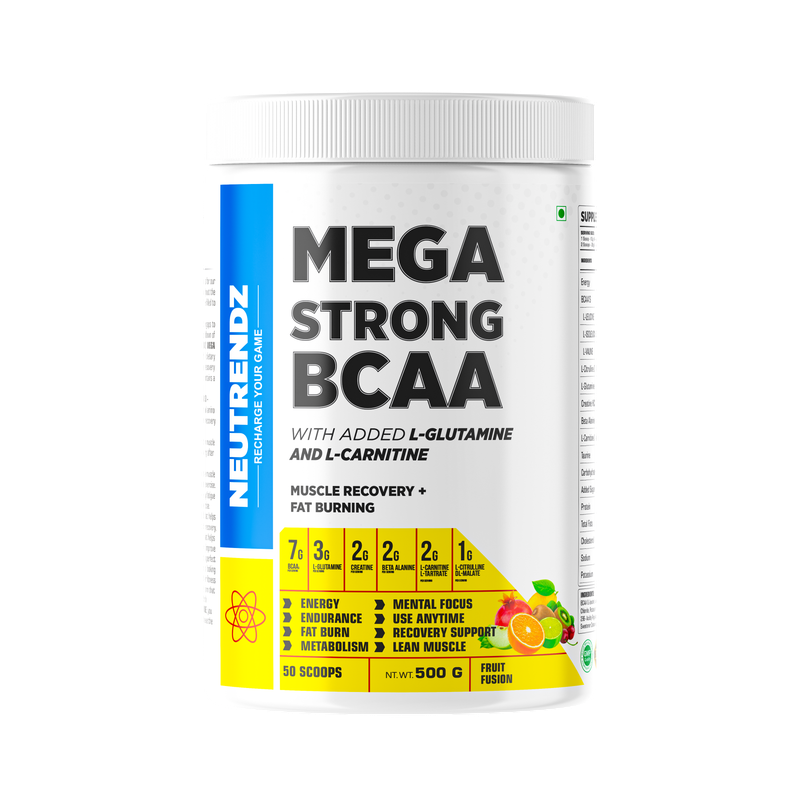 Neutrendz MEGA STRONG BCAA 500gm in Fruit Fusion flavor combines the benefits of branched-chain amino acids with a refreshing, tangy fruit flavor. This BCAA supplement supports muscle recovery, enhances endurance, and reduces muscle soreness after workouts. The fruity taste makes it a delightful addition to your fitness routine, ensuring that you enjoy every serving while reaping the benefits of improved muscle growth and faster recovery.