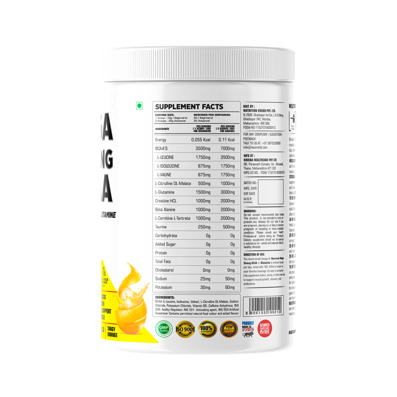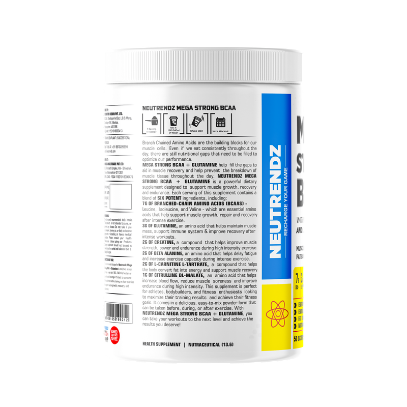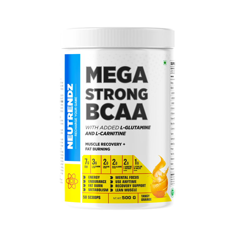 Neutrendz MEGA STRONG BCAA 500gm in Tangy Orange flavor provides a powerful blend of branched-chain amino acids (BCAAs) to support muscle recovery, reduce fatigue, and promote muscle growth. Ideal for athletes and fitness enthusiasts, this product ensures reduced muscle soreness and enhanced endurance, enabling you to push through intense workouts. The tangy orange flavor adds a refreshing twist, making it an enjoyable post-workout supplement for improved recovery.