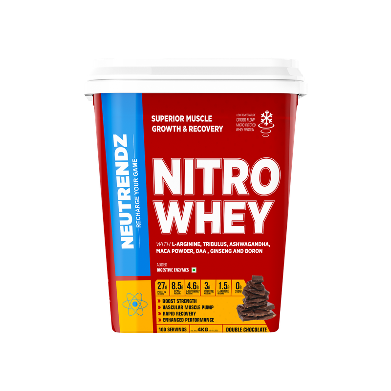 Neutrendz NITRO WHEY 27g Protein in Double Chocolate flavor now comes in a 4kg pack. Offering 27g of protein per serving, this large pack is perfect for serious athletes or fitness enthusiasts looking for high-quality protein and a rich, chocolatey taste to help with muscle recovery and growth.
