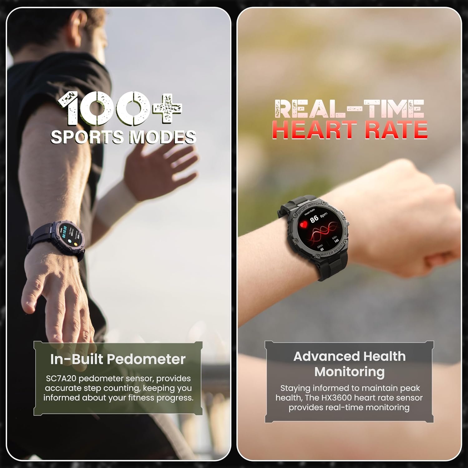 1.53″ TFT Round screen with BT Calling • IP67 Water Resistance • E-Card Share • Heart Rate/SPO2/Step/Sleep Tracker • 100+ sports mode • 80 Days Battery Life • Extra Silicone Strap
